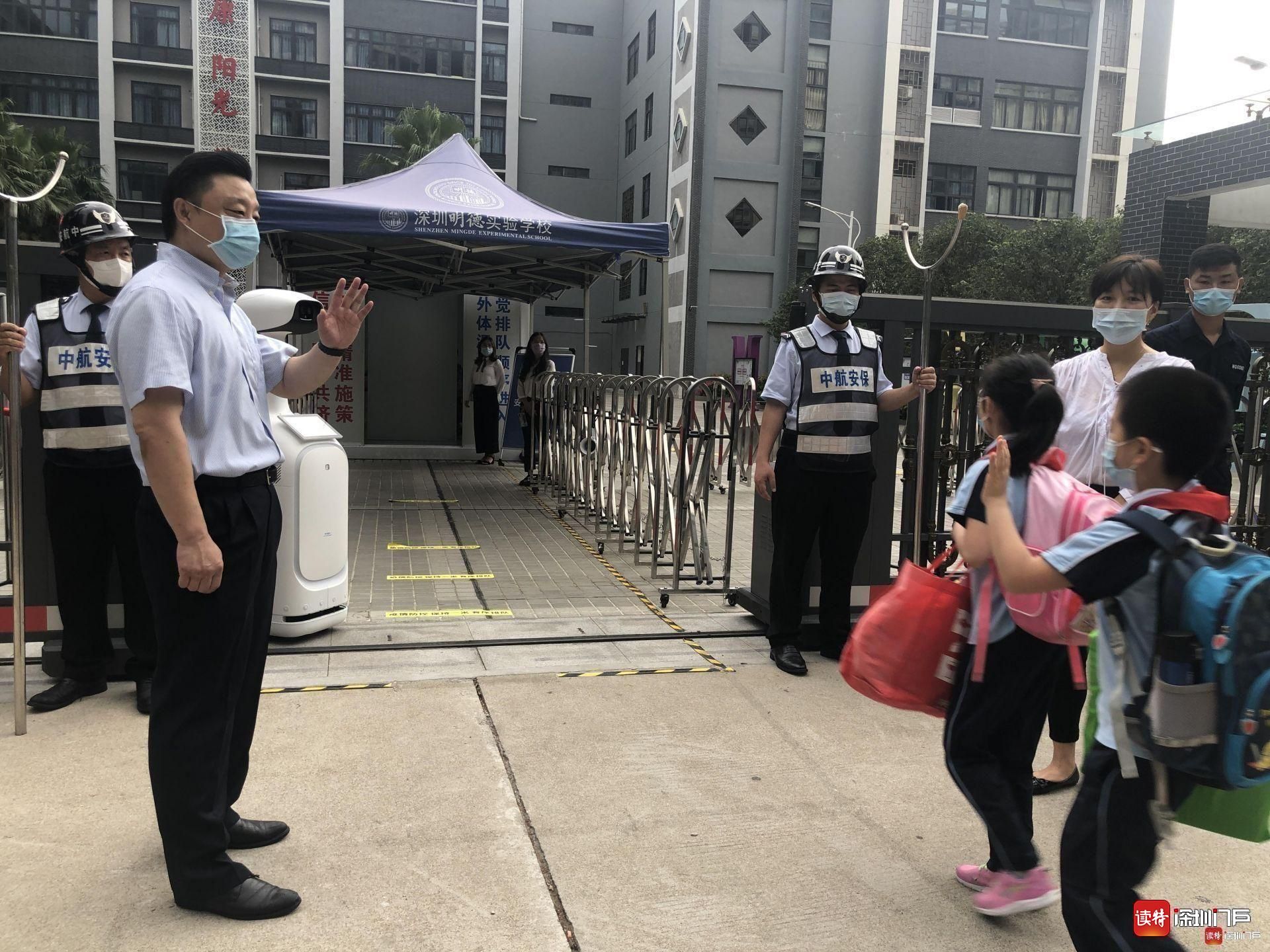 “同學(xué)們好!”“歡迎回來!”從7點(diǎn)起,明德實(shí)驗(yàn)學(xué)校校長魯江與工作人員就在香蜜校區(qū)校門口迎候?qū)W生們,提醒孩子們戴好口罩,也與家長們交流返校事宜。校門口的一臺(tái)超氧水消殺機(jī)器人也在積極投入工作,工作人員在后臺(tái)控制面板可以監(jiān)測到入校人員的體溫情況。