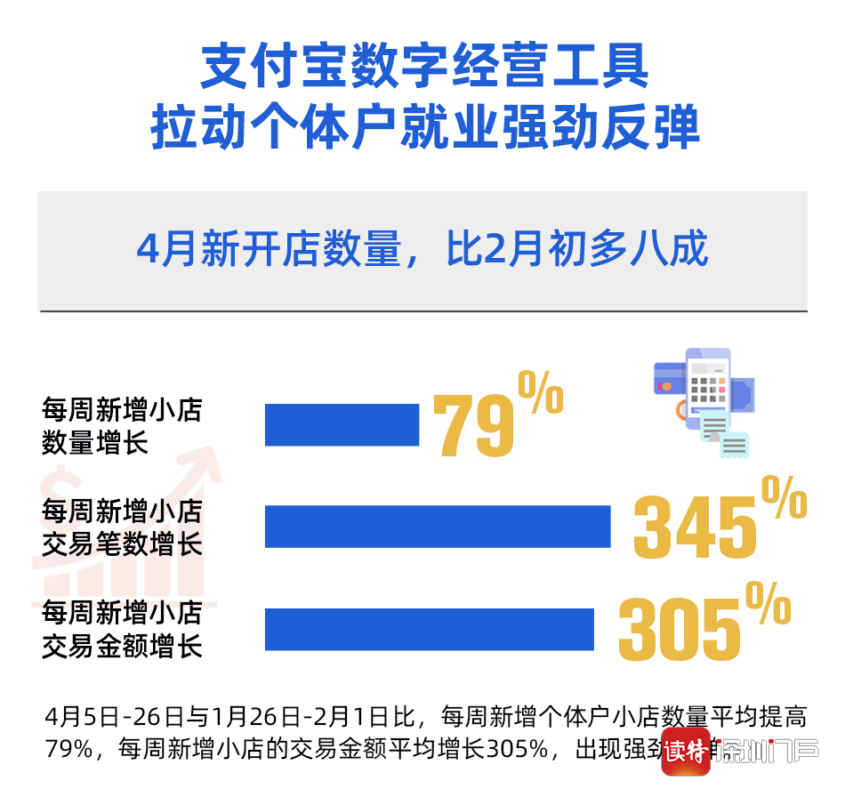 北京大學(xué)數(shù)字金融研究中心通過分析支付寶最新數(shù)據(jù)發(fā)現(xiàn),與疫情中最低點(diǎn)相比,全國(guó)個(gè)體戶就業(yè)形勢(shì)已出現(xiàn)強(qiáng)勁反彈:隨著復(fù)工復(fù)產(chǎn)的全面推進(jìn)和消費(fèi)券的發(fā)放,4月以來(lái)與疫情最低點(diǎn)2月1日當(dāng)周相比,每周新增個(gè)體戶小店數(shù)量平均提高79%,每周新增小店的交易金額平均增長(zhǎng)305%。