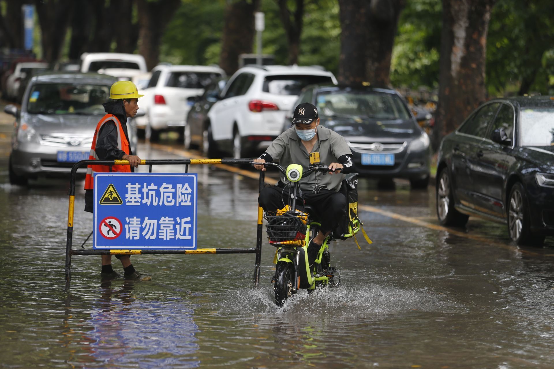 2020年5月26日中午13:46分,商報(bào)東二路,短時(shí)強(qiáng)降水導(dǎo)致路面水浸,一位騎士經(jīng)過水浸路面。