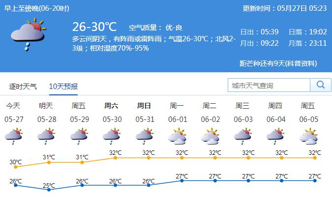 市氣象臺(tái)預(yù)測,27日-31日多云天氣為主,部分時(shí)間有陣雨或雷陣雨,氣溫逐日升高,天氣轉(zhuǎn)熱。27日多云間陰天,有陣雨或雷陣雨;氣溫26-30℃;北風(fēng)2-3級;相對濕度70%-95%。28-31日多云,可見陽光,部分時(shí)間有(雷)陣雨。6月1-2日多云,局地有短時(shí)陣雨。
