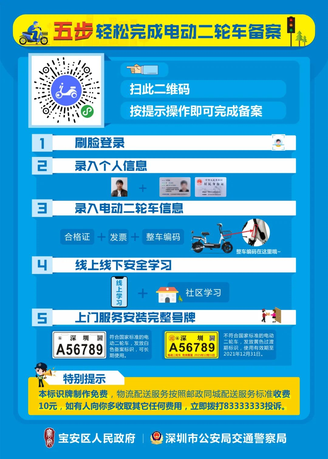 見圳客戶端·深圳新聞網(wǎng)2020年6月2日訊(見圳客戶端、深圳新聞網(wǎng)記者 鄭曉鵬)近日,網(wǎng)上流傳著這樣一張圖片,圖片上稱,6月1日起寶安、光明電動二輪車備案通道要關閉了。消息一出,便引起網(wǎng)友的廣泛關注“真的假的?”“那我的電動車還能上牌嗎?”“超標車是什么車?合標車又是什么車?”……記者從深圳市交警局獲悉,6月15日起,寶安區(qū)和光明區(qū)超標的電動二輪車將不再予以發(fā)放黃色過渡期標識;對于符合新國標標準的車輛,市民持深圳戶籍身份證或居住證即可辦理電動二輪車備案,發(fā)放可長期使用的白色標識。已備案的并發(fā)放黃牌標識的車輛仍可繼續(xù)使用,過渡期至2021年12月31日。