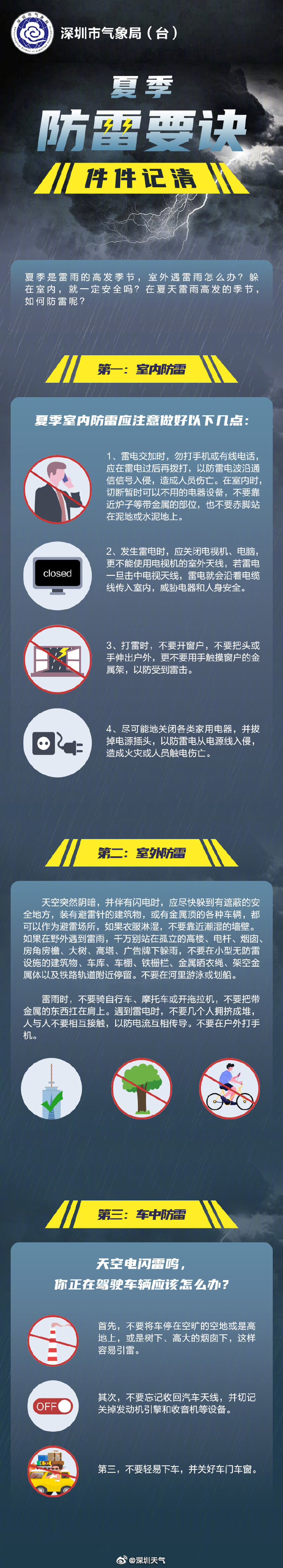 深圳市氣象臺(tái)于2020年06月05日11時(shí)15分在全市發(fā)布雷電預(yù)警,預(yù)計(jì)2小時(shí)內(nèi)全市將受雷電影響,市民停留在安全地方;按照防御預(yù)案停止戶外易燃易爆危險(xiǎn)作業(yè),并加強(qiáng)危化場(chǎng)所安全管理。
