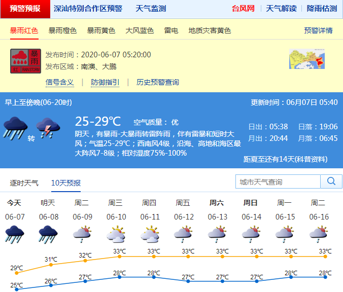 【06-07 05:25 】過去2小時(shí),南澳、大鵬街道累計(jì)雨量已達(dá)大暴雨,預(yù)計(jì)強(qiáng)降雨還將持續(xù)1-2小時(shí),深圳市氣象臺(tái)在南澳、大鵬街道發(fā)布暴雨紅色分區(qū)、大風(fēng)藍(lán)色分區(qū)、雷電預(yù)警,全市進(jìn)入暴雨緊急防御狀態(tài),請(qǐng)迅速做好防御工作。用人單位視情況安排工作人員推遲上班、提前下班或者停工。