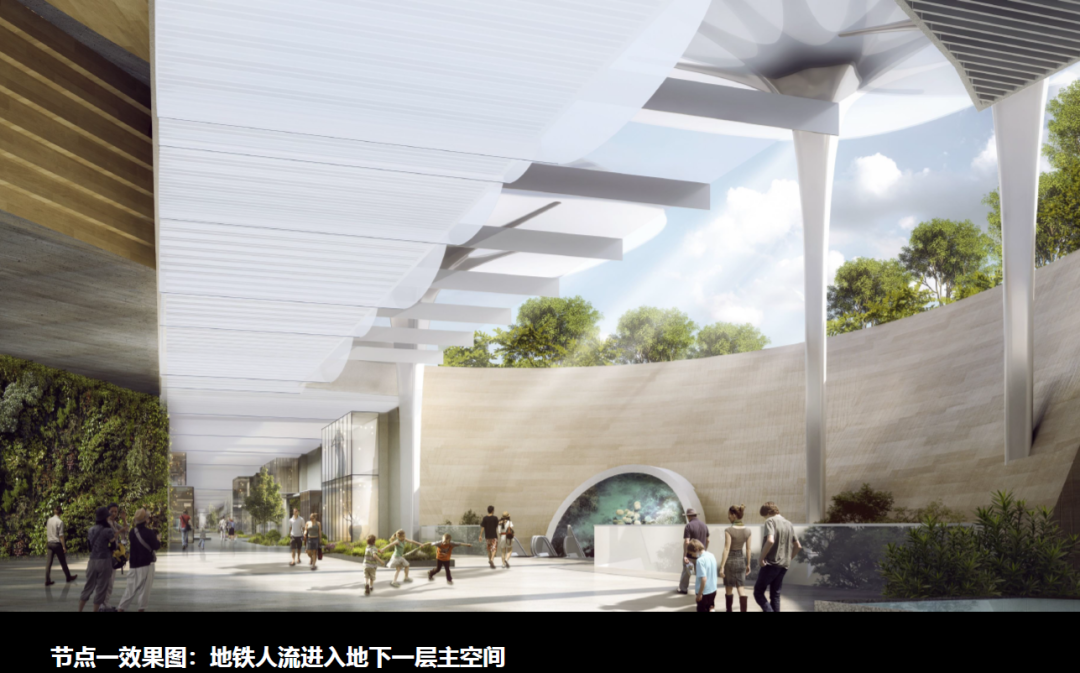 穿過(guò)洞穴般的地鐵出口,景象瞬間開(kāi)闊,陽(yáng)光透過(guò)構(gòu)筑物和煦的灑下,伴著兩側(cè)綠植和藝術(shù)墻緩緩升到負(fù)一層,達(dá)到商業(yè)線性軸和藝術(shù)通道的交匯處。