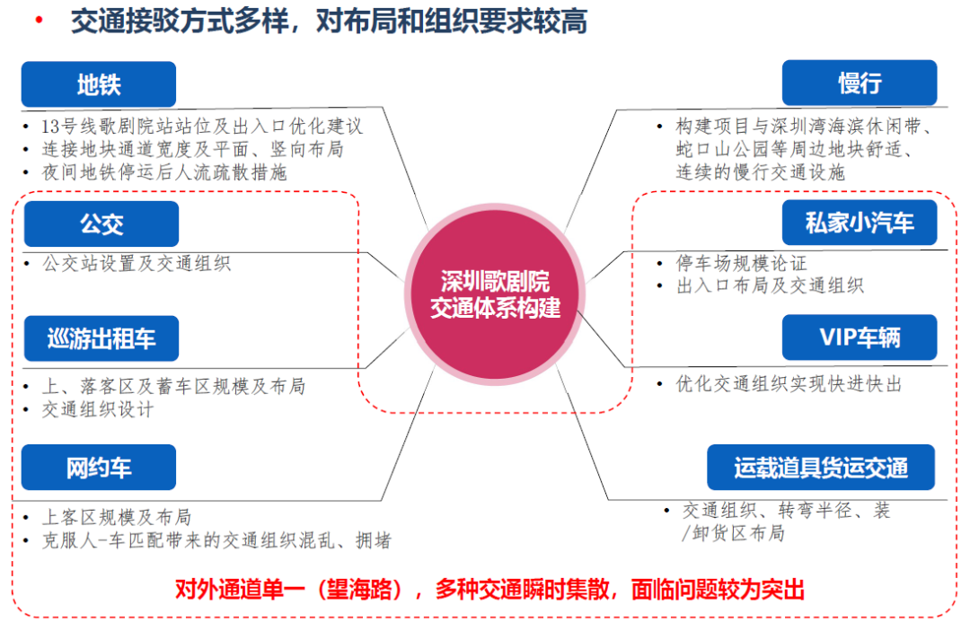 肯定了目前交通組織的總體方案,提出需充分利用地面望海路的交通疏散功能,考慮歌劇院作為地標(biāo)景點(diǎn)的吸引力,適當(dāng)增加停車(chē)位的彈性及可達(dá)性。同時(shí)建議市交通運(yùn)輸局需結(jié)合深圳歌劇院的建設(shè)重新對(duì)望海路地下快速路的規(guī)劃方案開(kāi)展研究工作。