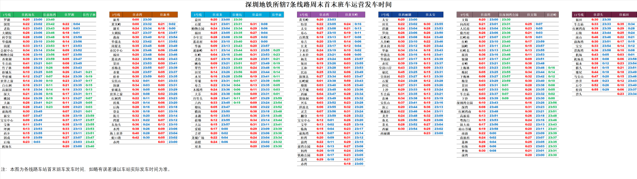 據(jù)介紹,周末期間1號線羅湖、機場東首班車時間提前至6:20,部分中間站的首班車最早提前至6:05左右;半程末班車服務延長至23:40分,分別從羅湖往前海灣、機場東往竹子林方向發(fā)車。2號線往新秀方向部分中間站首班車提前至6:00,往赤灣方向末班車延長至23:30。3號線部分中間站的首班車提前至6:05左右;半程末班列車服務保持原有的23:30,分別從益田往塘坑、雙龍往華新發(fā)車。9號線部分中間站的首班車最早提前至6:05左右;半程末班列車服務延長至23:30,分別從文錦至深圳灣公園、前灣至孖嶺發(fā)車。