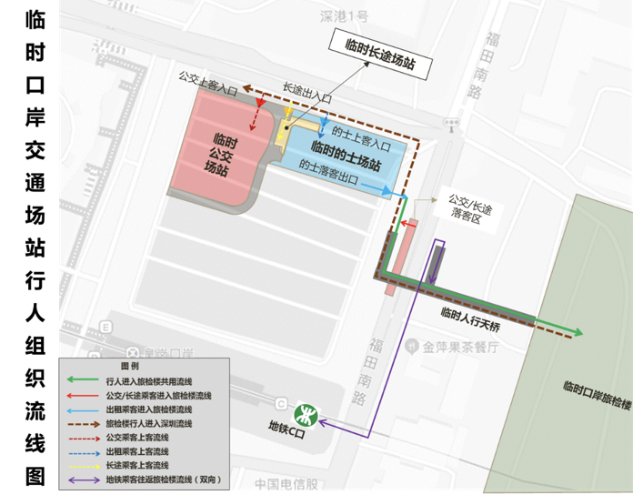 臨時口岸旅檢樓位于福田南路東側(cè),臨時交通接駁場站(公交場站、出租車場站、長途客運站)位于福田南路西側(cè)、百合路路南側(cè)。