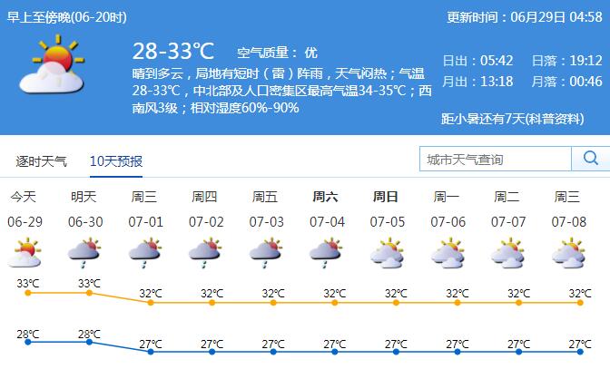 見圳客戶端·深圳新聞網(wǎng)2020年6月29日訊 我市29日晴到多云,局地有短時(shí)(雷)陣雨,天氣悶熱;氣溫28-33℃,中北部及人口密集區(qū)最高氣溫34-35℃;西南風(fēng)3級(jí);相對(duì)濕度60%-90%。