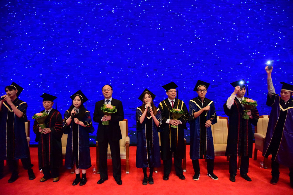今天這場典禮和以往有些不同:許多朝夕相處的同學(xué)還沒來得及互道珍重,就已經(jīng)各奔前程。前些日子,我爬遍了深圳十大名山,本想以最fit的狀態(tài)為全體畢業(yè)生一一頒授學(xué)位,無奈事與愿違。作為校長,不能在重要時刻與大家逐一同框,讓我十分遺憾。即便如此,學(xué)校還是堅(jiān)持按往年的規(guī)格為畢業(yè)生代表舉行這場儀式,希望盡可能讓大家在特殊的年份感受母校給予的溫暖和信心。沒來現(xiàn)場的家長、同學(xué)可以通過直播參與典禮。此刻,近萬名畢業(yè)生,近萬個家庭和全社會所有關(guān)心支持你們的人都在刷屏、點(diǎn)贊、發(fā)彈幕,我提議,讓我們用掌聲把共鳴打在公屏上!