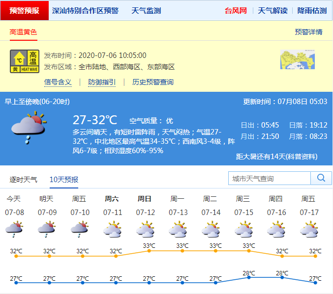 見圳客戶端·深圳新聞網(wǎng)2020年7月8日訊 據(jù)深圳市氣象臺(tái)預(yù)測(cè),深圳今日多云間晴天,有短時(shí)雷陣雨,天氣悶熱;氣溫27-32℃,中北地區(qū)最高氣溫34-35℃;西南風(fēng)3-4級(jí),陣風(fēng)6-7級(jí);相對(duì)濕度60%-95%。