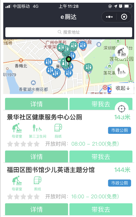 第二個(gè)功能是查看廁所情況。如果市民想知道廁所是否爆滿(mǎn),有沒(méi)有母嬰室,衛(wèi)生情況如何,點(diǎn)擊任意廁所可查看每座公廁的詳細(xì)情況。