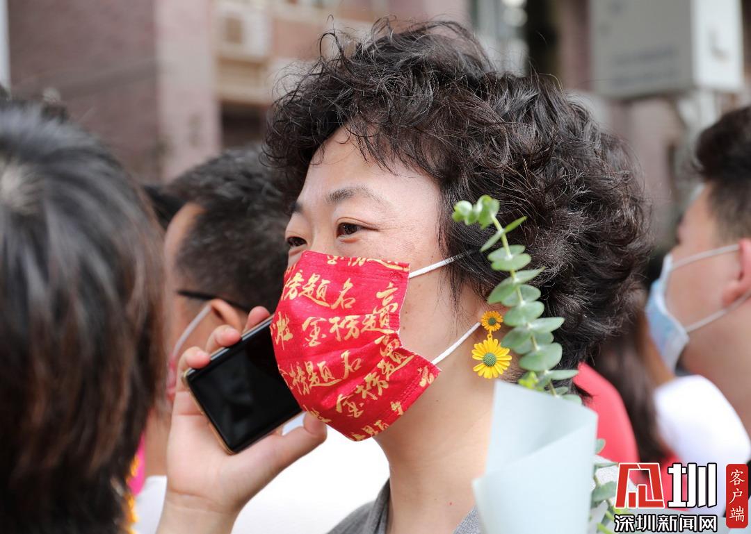 考點(diǎn)門口,家長(zhǎng)戴高考必勝紅色“金榜題名”口罩。
