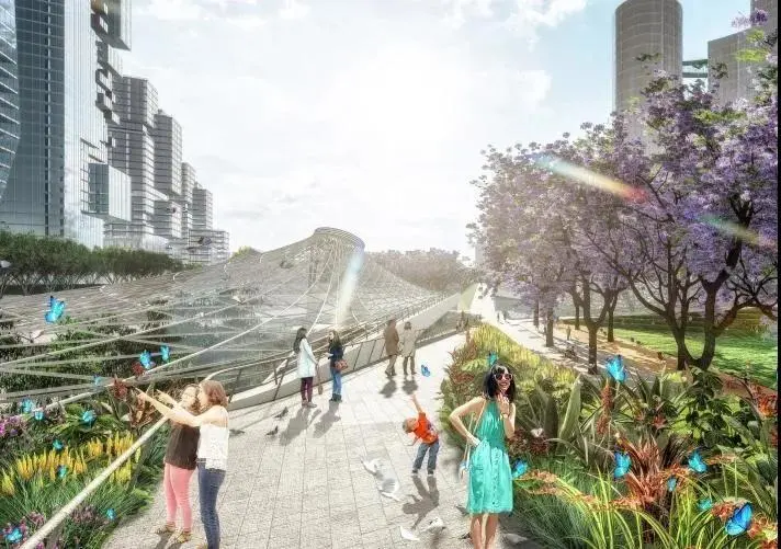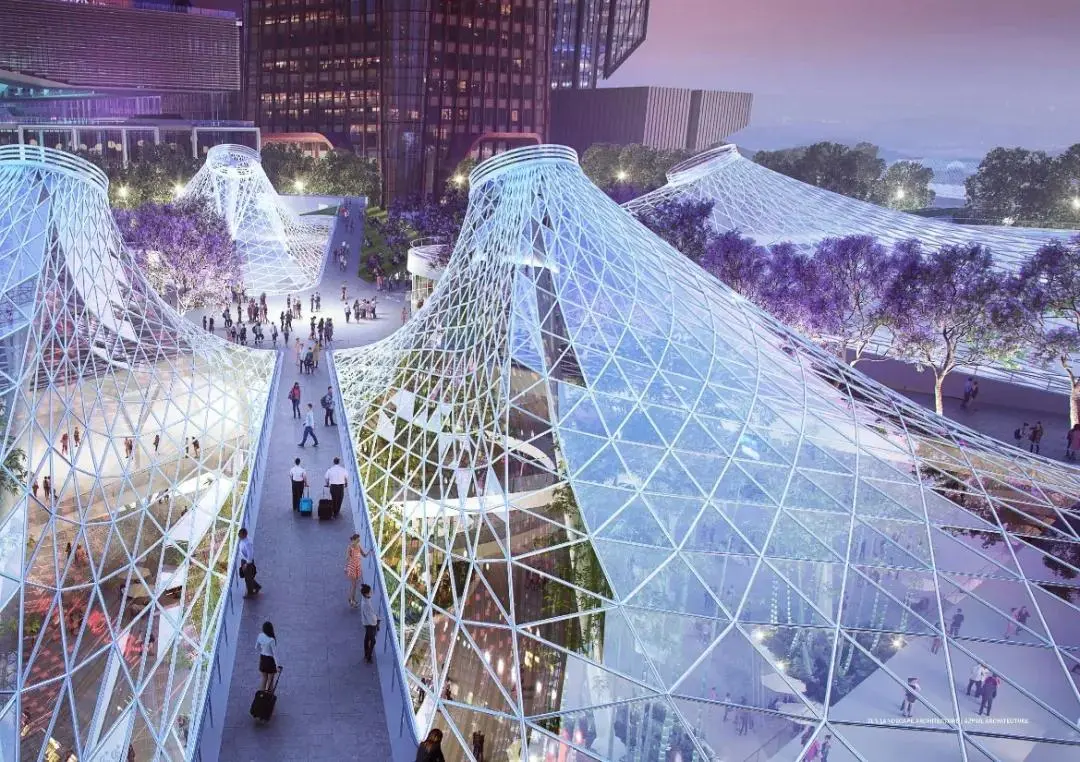 為車站廣場,“水晶山丘”屋面覆蓋著地下車站樞紐大廳,同時也在地面創(chuàng)造出造型獨特的城市地標。光影和夜景效果與交叉的藍花楹大道配合,打造一個極具設計感的交通集散空間。地下共享大廳、地下森林與地面廣場、周邊建筑建立視覺聯(lián)系,成為中央綠軸美景的一部分。