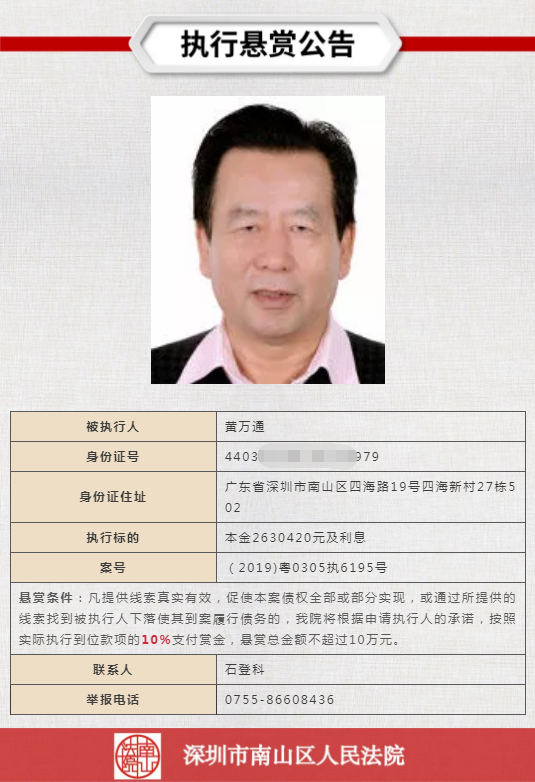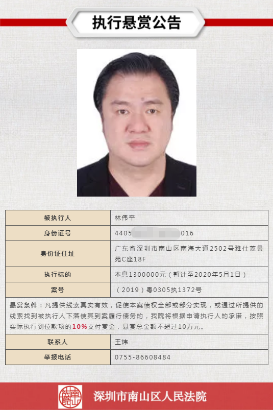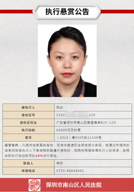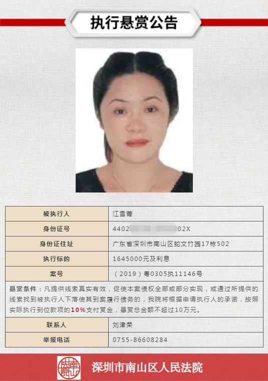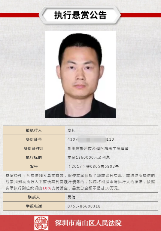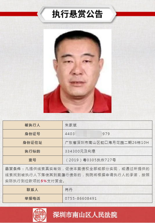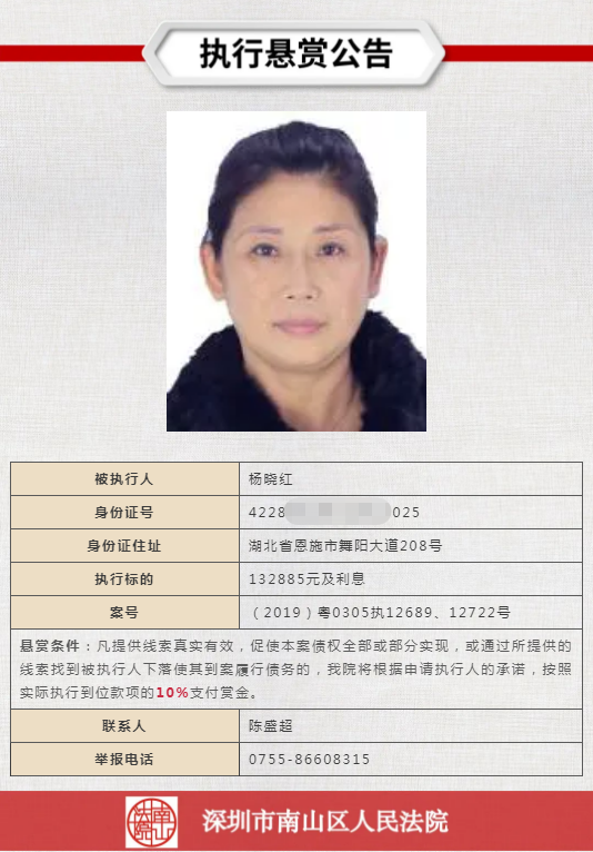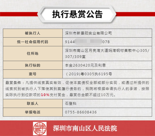 經申請執(zhí)行人申請,深圳市南山區(qū)人民法院向社會發(fā)布懸賞舉報公告,凡提供線索真實有效,促使本案債權全部或部分實現,或通過所提供的線索找到被執(zhí)行人下落使其到案履行債務的,深圳市南山區(qū)人民法院將根據申請執(zhí)行人的承諾,按照實際執(zhí)行到位款項給予一定金額的賞金。