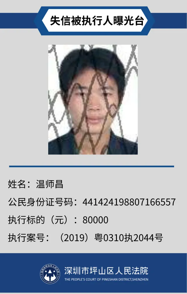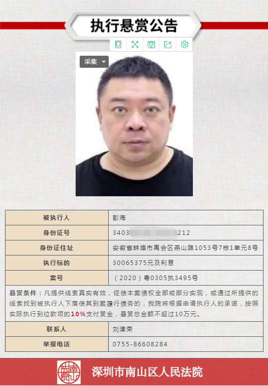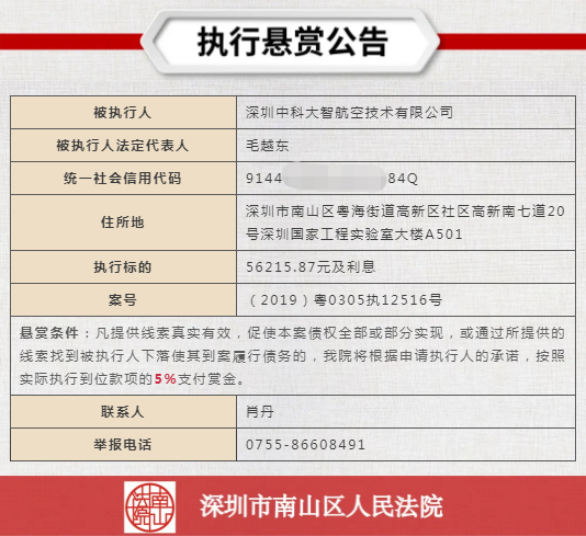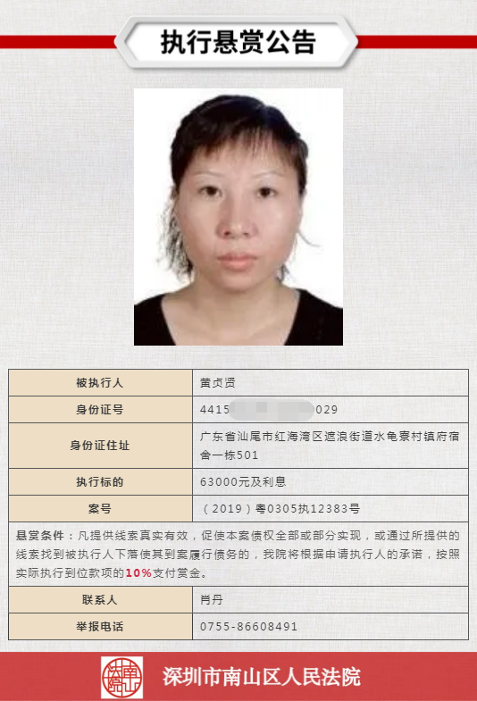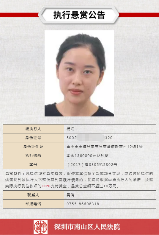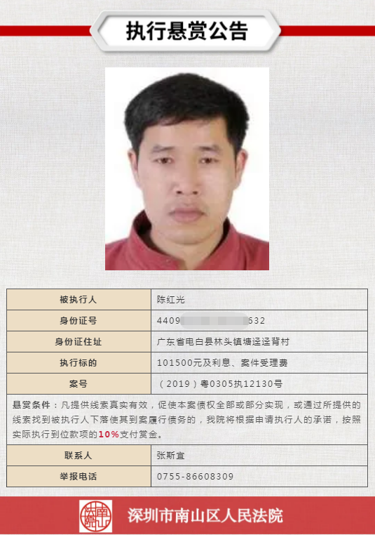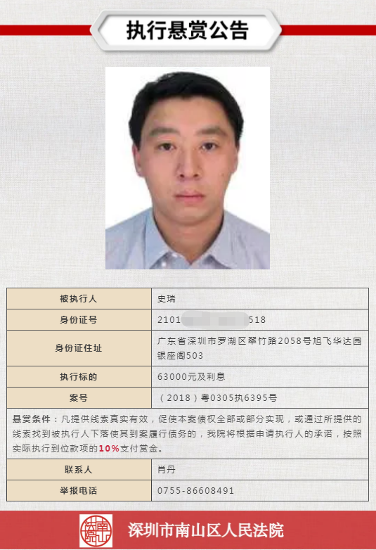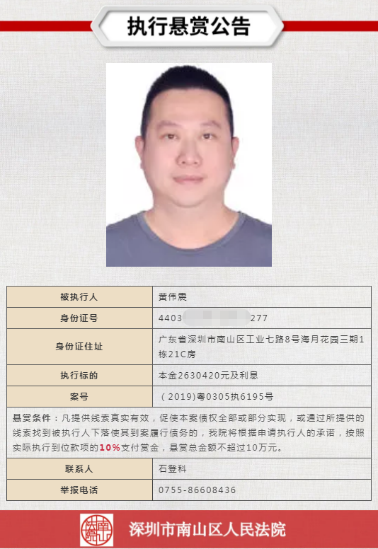 經申請執(zhí)行人申請,深圳市南山區(qū)人民法院向社會發(fā)布懸賞舉報公告,凡提供線索真實有效,促使本案債權全部或部分實現,或通過所提供的線索找到被執(zhí)行人下落使其到案履行債務的,深圳市南山區(qū)人民法院將根據申請執(zhí)行人的承諾,按照實際執(zhí)行到位款項給予一定金額的賞金。