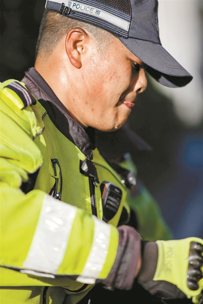 “深圳最近的天氣太熱了,到了中午,地面溫度估計得有40℃了,我們因為戴著口罩,外頭還得加上頭盔,感覺確實挺難受的。”深圳交警南山大隊機(jī)訓(xùn)中隊的鐵騎小哥時云財,每天早高峰開始就駕駛鐵騎穿梭在大街小巷,直到中午太陽最盛的時候。摘下頭盔,眼睫毛上都是汗滴,更不用說脫下熒光黃的制服,里面是層層疊疊早已被浸透發(fā)白的衣衫。
