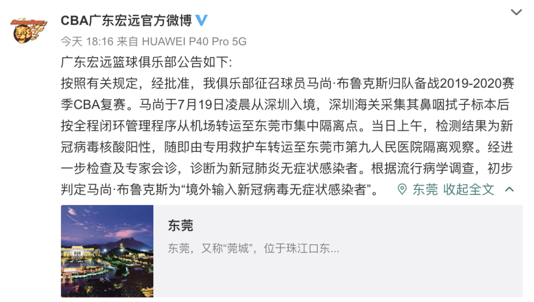 7月19日,廣東新增境外輸入無癥狀感染者1例,為東莞報(bào)告,來自美國,在入境口岸發(fā)現(xiàn)。經(jīng)確認(rèn),此人是CBA廣東宏遠(yuǎn)男籃外援馬尚·布魯克斯。