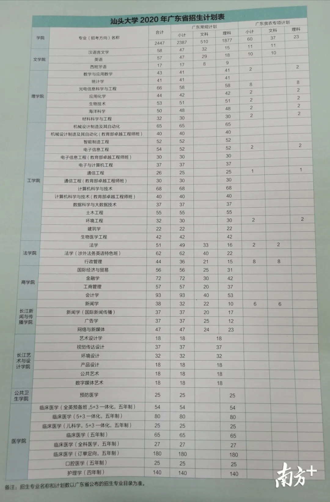 汕大本科生招生計劃數(shù)為3100人,新增預(yù)防醫(yī)學(xué)、藥學(xué)專業(yè),分別招生30人、20人,并增加新聞學(xué)專業(yè),新增國際新聞傳播方向,招生45人。