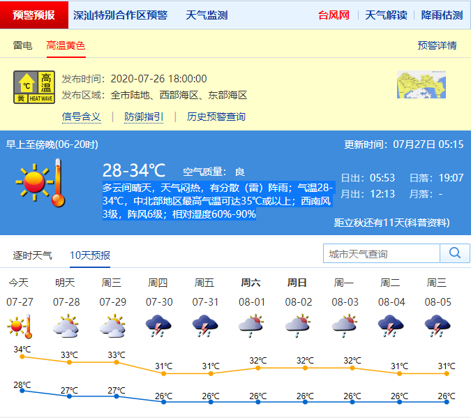 見圳客戶端?深圳新聞網(wǎng)2020年7月27日訊 根據(jù)深圳氣象局官方消息,深圳7月27日白天多云間晴天,天氣悶熱,有分散(雷)陣雨;氣溫28-34℃,中北部地區(qū)最高氣溫可達(dá)35℃或以上;西南風(fēng)3級(jí),陣風(fēng)6級(jí);相對(duì)濕度60%-90%。