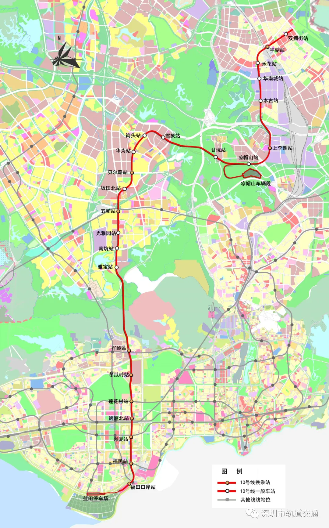地鐵10號(hào)線起自福田區(qū)福田口岸站,終至龍崗區(qū)雙擁街站,途經(jīng)福田、龍華、龍崗3區(qū),線路全長(zhǎng)約29km,采用全地下敷設(shè)方式,共設(shè)站24座(其中換乘站11座)。