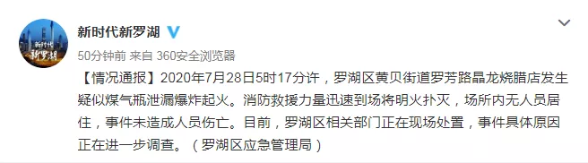 【情況通報】2020年7月28日5時17分許,羅湖區(qū)黃貝街道羅芳路晶龍燒臘店發(fā)生疑似煤氣瓶泄漏爆炸起火。消防救援力量迅速到場將明火撲滅,場所內無人員居住,事件未造成人員傷亡。目前,羅湖區(qū)相關部門正在現(xiàn)場處置,事件具體原因正在進一步調查。(羅湖區(qū)應急管理局)