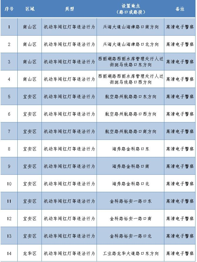 見圳客戶端·深圳新聞網(wǎng)2020年7月28日訊 為保障道路的通行有序和安全,加大對機動車違法行為的非現(xiàn)場執(zhí)法力度,保障深圳道路交通安全暢順。近期,深圳交警根據(jù)《道路交通安全違法行為處理程序規(guī)定》(公安部令105號)第十六條規(guī)定,依法公布啟用262套交通技術(shù)監(jiān)控設(shè)備。