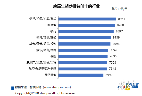 報(bào)告顯示,應(yīng)屆生起薪排名前十的行業(yè)中,信托/擔(dān)保/拍賣/典當(dāng)、中介服務(wù)、銀行等行業(yè)為起薪排名前三名,分別為8961元,8768元和8597元。除此之外,教育/培訓(xùn)/院校、娛樂(lè)/體育/休閑等受益于直播經(jīng)濟(jì)的帶動(dòng)和數(shù)字化的發(fā)展,也向應(yīng)屆生開出了相對(duì)高的薪酬。
