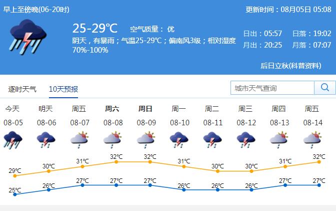 見圳客戶端·深圳新聞網(wǎng)2020年8月5日訊 今日我市陰天,有暴雨;氣溫25-29℃;偏南風3級;相對濕度70%-100%。深圳市氣象臺于2020年8月5日5時15分在全市發(fā)布雷電預警,今天上午海上將不斷有降雨云團生成,受其影響我市有零散雷暴;未來6小時累計雨量將達暴雨,深圳市氣象臺于2020年8月5日5時40分在全市發(fā)布暴雨黃色預警,全市進入暴雨戒備狀態(tài),需注意防范。市民停留在安全地方;按照防御預案停止戶外易燃易爆危險作業(yè),并加強?;瘓鏊踩芾?。