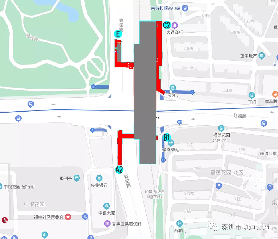 其中,B1口為既有3號線B1口;C2口接蓮花二村小區(qū)及既有3號線C口(彩田路東側(cè));E口蓮花山腳(彩田路西側(cè))、A2口接中銀大廈北側(cè)及既有3號線A口(紅荔路南側(cè))。