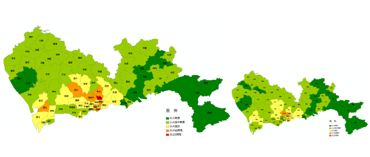 圖3 預計臺風季工作日(左)、普通工作日(右)晚高峰全市主要街道交通運行狀態(tài)圖