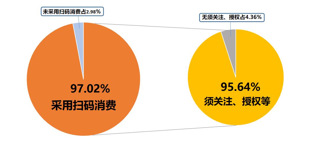 根據(jù)深圳市消委會初步調(diào)查,共走訪了36個大中型商超,26個連鎖餐飲品牌。統(tǒng)計(jì)數(shù)據(jù)顯示,有97.02%的商家采用了掃碼消費(fèi),其中95.64%的商家在掃碼后仍須關(guān)注或授權(quán)才可進(jìn)行消費(fèi)。