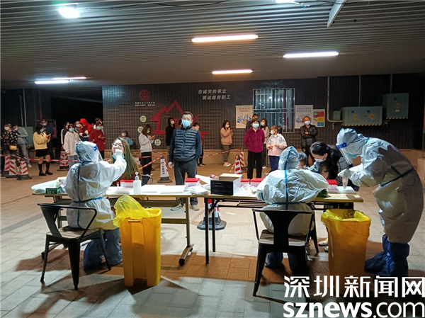 “放碼過(guò)來(lái)!”1月16日晚8點(diǎn),在羅湖區(qū)桂園街道老圍花園五樓架空層的臨時(shí)檢測(cè)點(diǎn),志愿者陳東紅在錄入?yún)^(qū)掃碼,十人一組,一一掃過(guò)、上傳,引導(dǎo)去采樣臺(tái)。