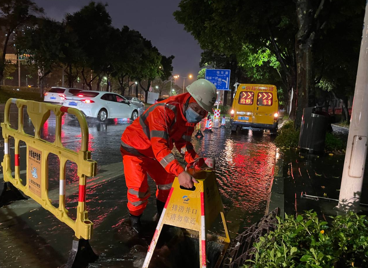 深圳環(huán)水集團(tuán)福田分公司員工堅(jiān)守在北環(huán)立交梅秀路口易淹點(diǎn),打開雨水篦子加速排水。(深圳新聞網(wǎng)記者 潘潤(rùn)華 通訊員 陶柳)