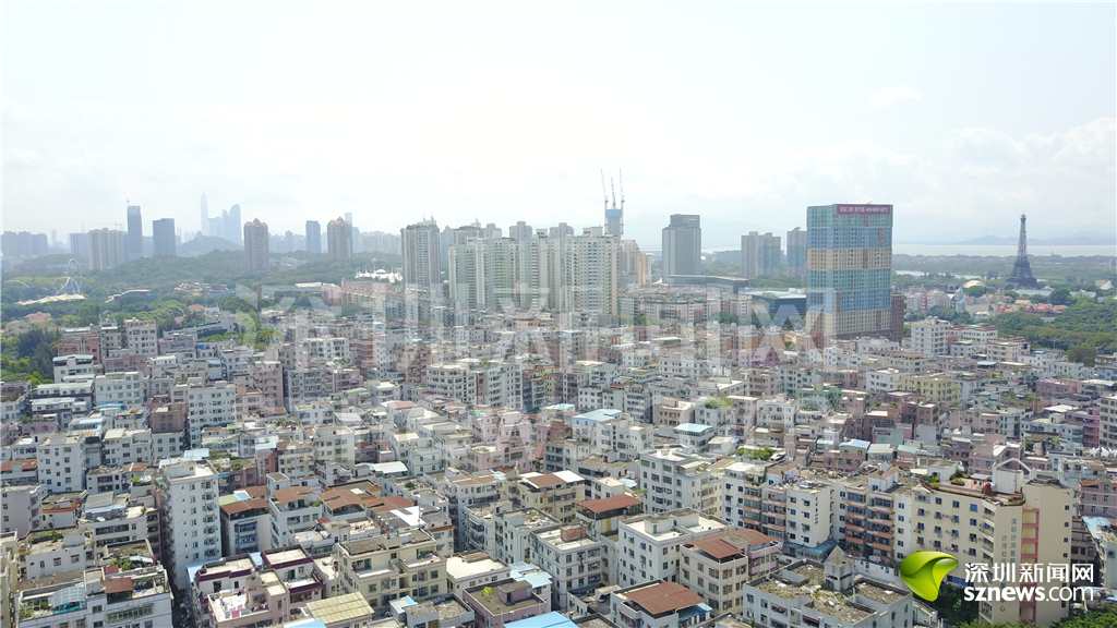 從白石洲低矮的“握手樓”上空看去,世界之窗標(biāo)志性建筑“埃菲爾鐵塔”依稀可見(jiàn)