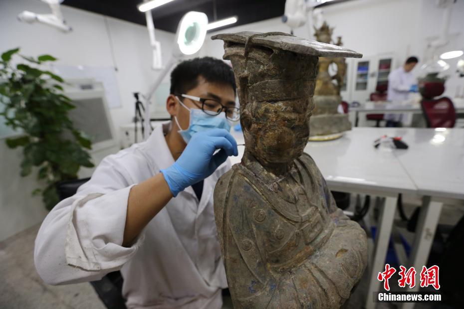 “文物醫(yī)生”在“文物修復(fù)室”內(nèi)工作。中新社記者 張遠(yuǎn) 攝
