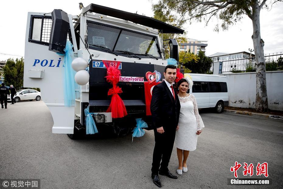 當(dāng)?shù)貢r(shí)間2018年3月21日,土耳其安塔利亞,警官Ceren Ekici和Taha YasinGul舉行婚禮。在10個(gè)月前的一次行動(dòng)中,Taha YasinGul不慎開槍擊中Ceren Ekici的頭部,所幸沒有造成生命危險(xiǎn)。他們的婚禮由警局同事操辦,同事們舉著防彈盾牌,護(hù)送這對新人走向禮臺。圖片來源:視覺中國