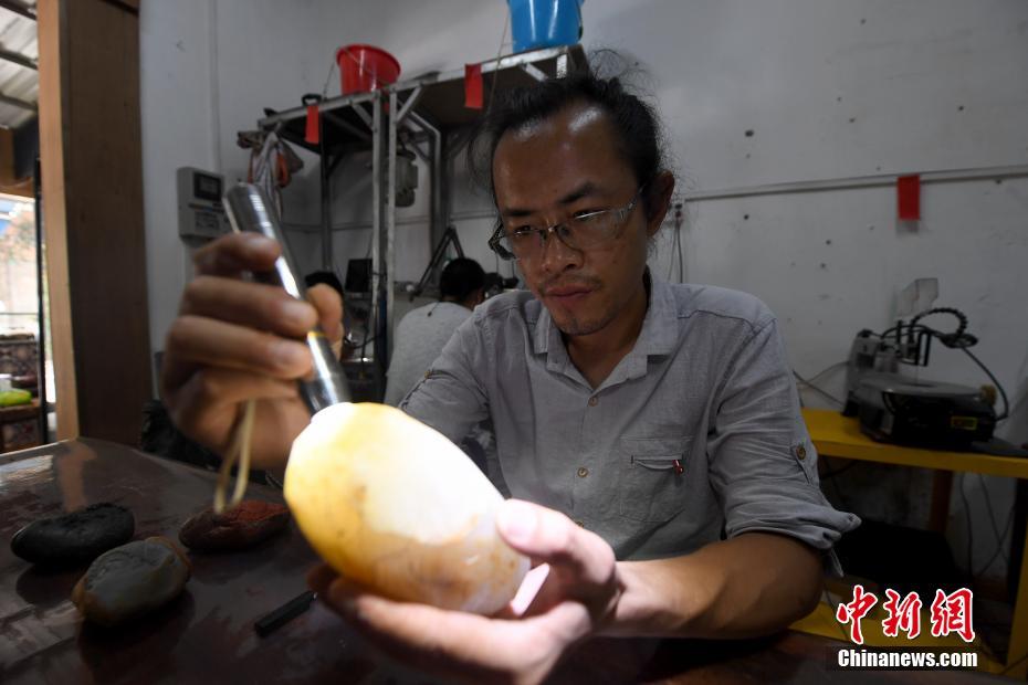 6月20日,廣西南寧市唐人文化街,錢思宇正在審料。1984年的錢思宇出生于湖南懷化,自小喜愛把玩石頭,受父輩影響,從2012年開始從事玉石雕刻工作至今。據(jù)了解,其設(shè)計(jì)的壯鄉(xiāng)玉雕作品,以人物為主,采用廣西當(dāng)?shù)靥赜械氖?,結(jié)合壯文化中的銅鼓、壯錦等元素,通過(guò)刻畫“壯鄉(xiāng)人”的神態(tài),表達(dá)廣西特有的“壯鄉(xiāng)情”。中新社記者 俞靖 攝