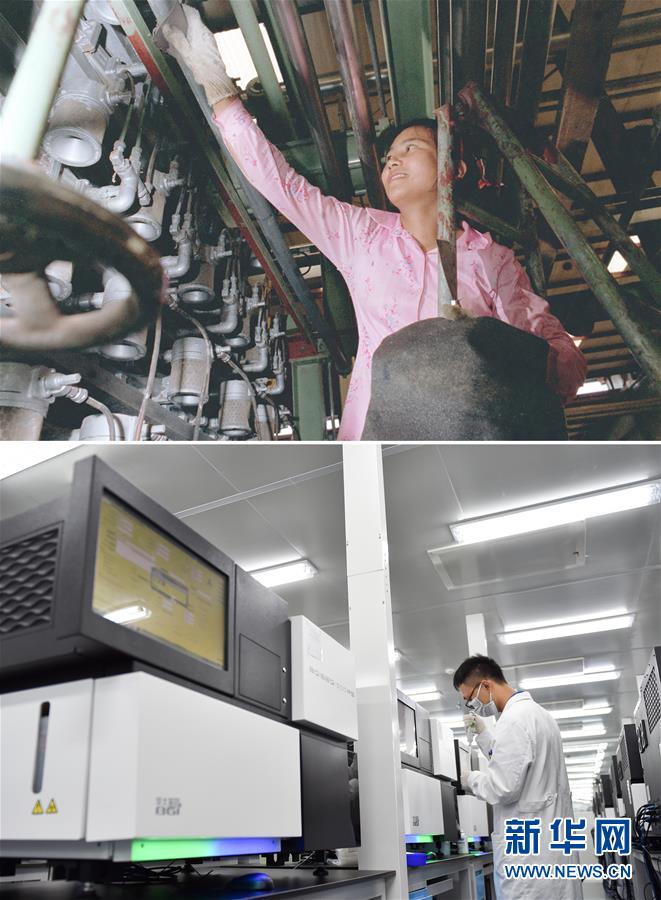 拼版照片:上圖為工人在位于深圳大鵬灣的一家染廠工作(資料照片,新華社記者楊紹明攝);下圖為2017年7月13日,工作人員在國(guó)家基因庫(kù)操作基因測(cè)序儀(新華社記者毛思倩攝)。建設(shè)于大鵬灣畔的深圳國(guó)家基因庫(kù)于2011年由國(guó)家發(fā)改委等部委批復(fù),2016年9月22日正式開(kāi)業(yè)。新華社發(fā)