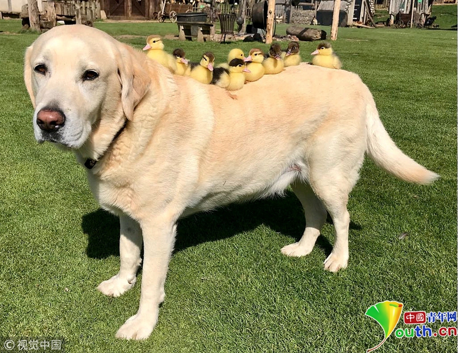2018年5月22日訊(具體拍攝時(shí)間不詳),英國(guó)艾塞克斯郡芒特菲奇特城堡,一只名為弗雷德的拉布拉多和它“收養(yǎng)” 的9只小鴨子。小鴨子的媽媽突然失蹤,10歲的弗雷德就成了它們的“新爸爸”。