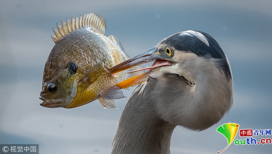 當?shù)貢r間2018年1月29日,美國田納西州納什維爾的拉德諾湖州立公園,一只大藍鷺刺穿了一條“巨大的”藍鰓魚,一口氣把它吞下。