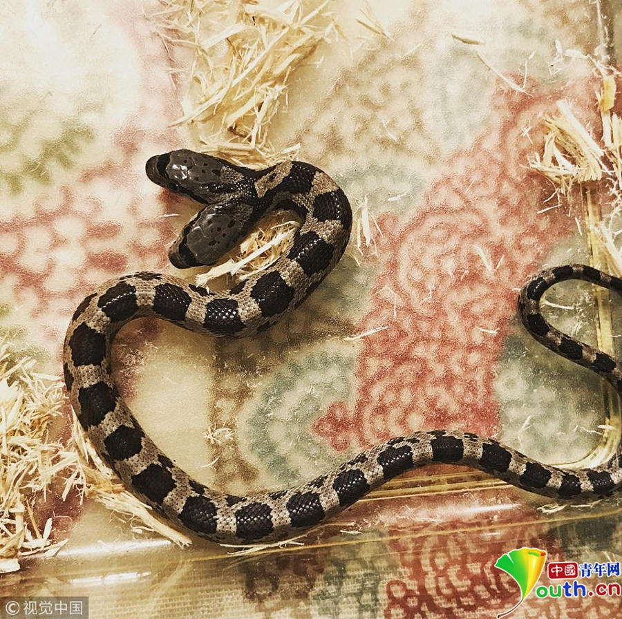 6月6日消息,在美國路易斯安那州新奧爾良,野生動物專家Tanee Janusz收養(yǎng)了同事在后院發(fā)現(xiàn)的一只雙頭錦蛇。據(jù)報道,該雙頭蛇由于基因缺陷而擁有兩只頭,概率僅有萬分之一,Tanee Janusz為兩只蛇頭分別起了名字,這對“雙胞胎”擁有不同的性格,經常因為往哪走扭作一團。 圖片來源:視覺中國