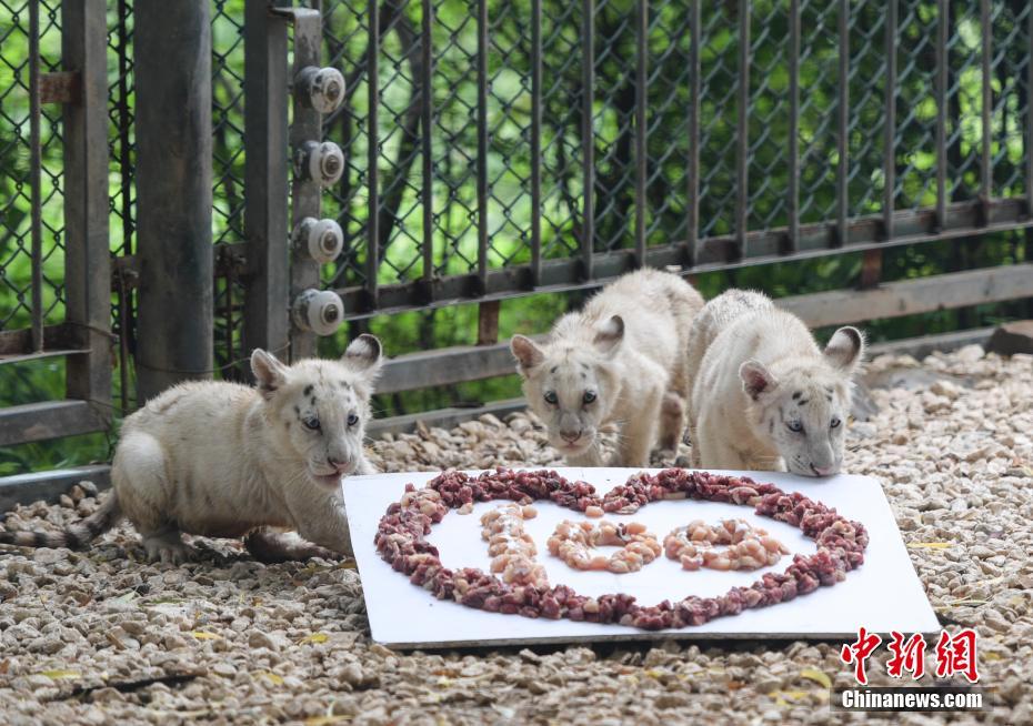 7月10日,雪虎五胞胎分享“肉餡蛋糕”。當(dāng)日,濟(jì)南野生動(dòng)物世界五胞胎雪虎誕生滿百日,正式與游客見面。中新社記者 張勇攝