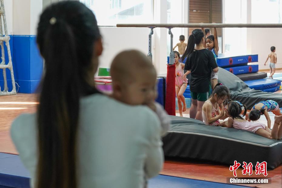 7月16日,貴州榕江,一位母親抱著孩子在訓(xùn)練室門外看著孩子們訓(xùn)練。位于月亮山深處的貴州省黔東南苗族侗族自治州榕江縣,數(shù)十年來堅(jiān)持少年兒童體操培養(yǎng)、訓(xùn)練,對于全縣有良好身體條件的少年兒童進(jìn)行免費(fèi)集中培訓(xùn)。目前該縣每年有60余名兒童在業(yè)余體操運(yùn)動學(xué)校進(jìn)行訓(xùn)練。炎炎夏日,孩子們不懼酷暑,刻苦訓(xùn)練追尋著自己的“體操夢”。據(jù)了解,自1972年以來,榕江縣先后向貴州省體操隊(duì)、蹦床隊(duì)輸送了21名運(yùn)動員;其中有6名運(yùn)動員進(jìn)入國家體操隊(duì),10名運(yùn)動員榮獲“國家健將級運(yùn)動員”稱號,5名運(yùn)動員榮獲“國際健將級運(yùn)動員”稱號,其中體操名將劉榕冰是2014年體操世錦賽男團(tuán)冠軍成員之一。2004年,榕江縣被貴州省體育局授予“貴州體操之鄉(xiāng)”稱號。中新社記者賀俊怡 攝