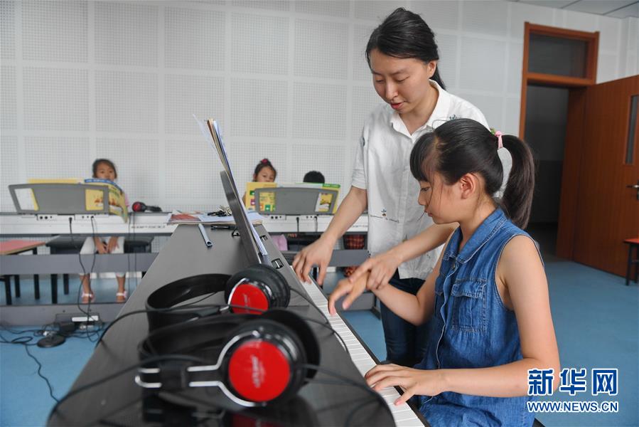 7月16日,在長(zhǎng)春市少年宮,教師邢晨(右二)給學(xué)生上鋼琴課。