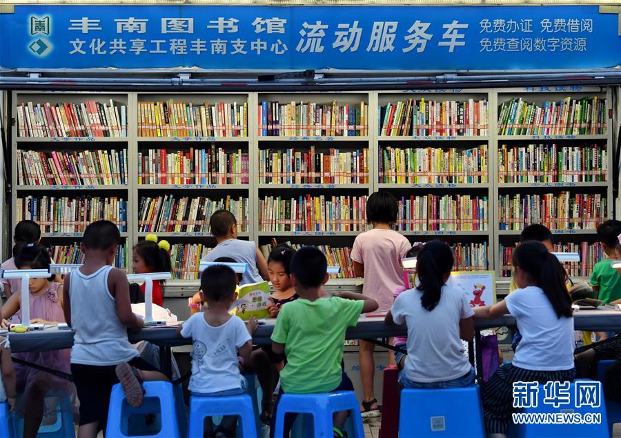 7月16日,唐山市豐南區(qū)金都花園社區(qū)的小朋友在流動(dòng)服務(wù)車前翻閱圖書。新華社記者 楊世堯攝