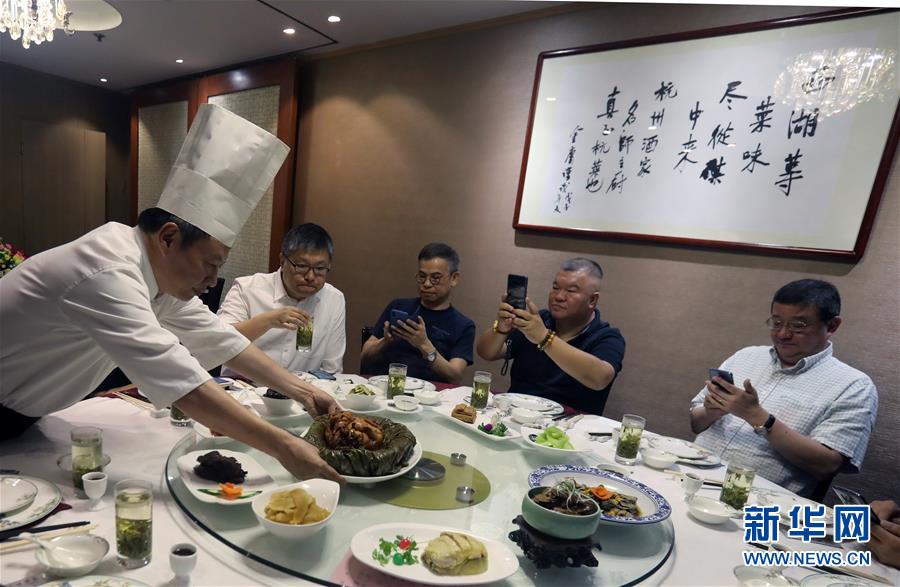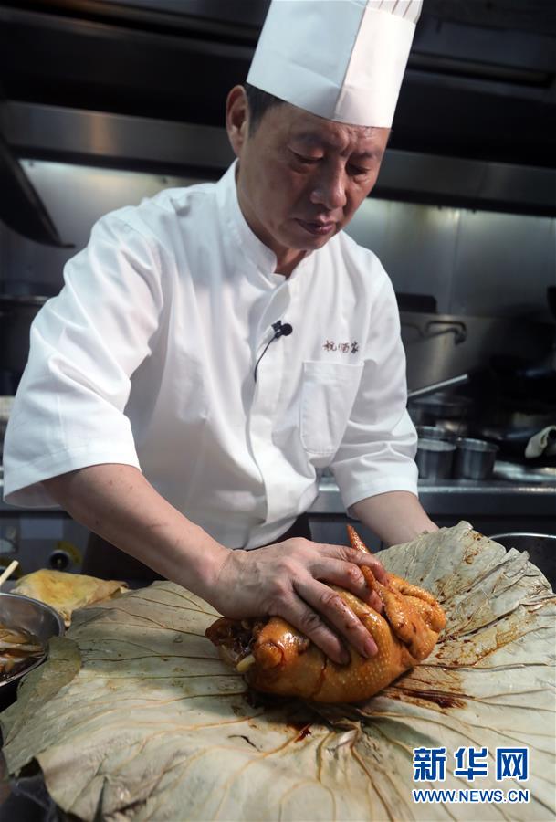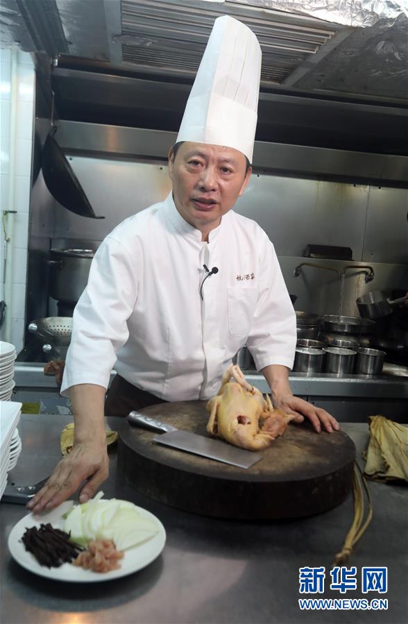 杭州酒家老板吳瑞康向記者介紹“叫化雞”的制作工序(6月16日攝)。 金庸在武俠小說(shuō)《神雕俠侶》中借郭靖之口說(shuō)過(guò): “為國(guó)為民,俠之大者?!蔽鋫b精神在香港備受推崇,有其心向中華文化的情感基礎(chǔ)。在這個(gè)國(guó)際美食之都,品味舌尖上的武俠味,內(nèi)中的感覺(jué)別有深意。新華社記者 李鵬 攝