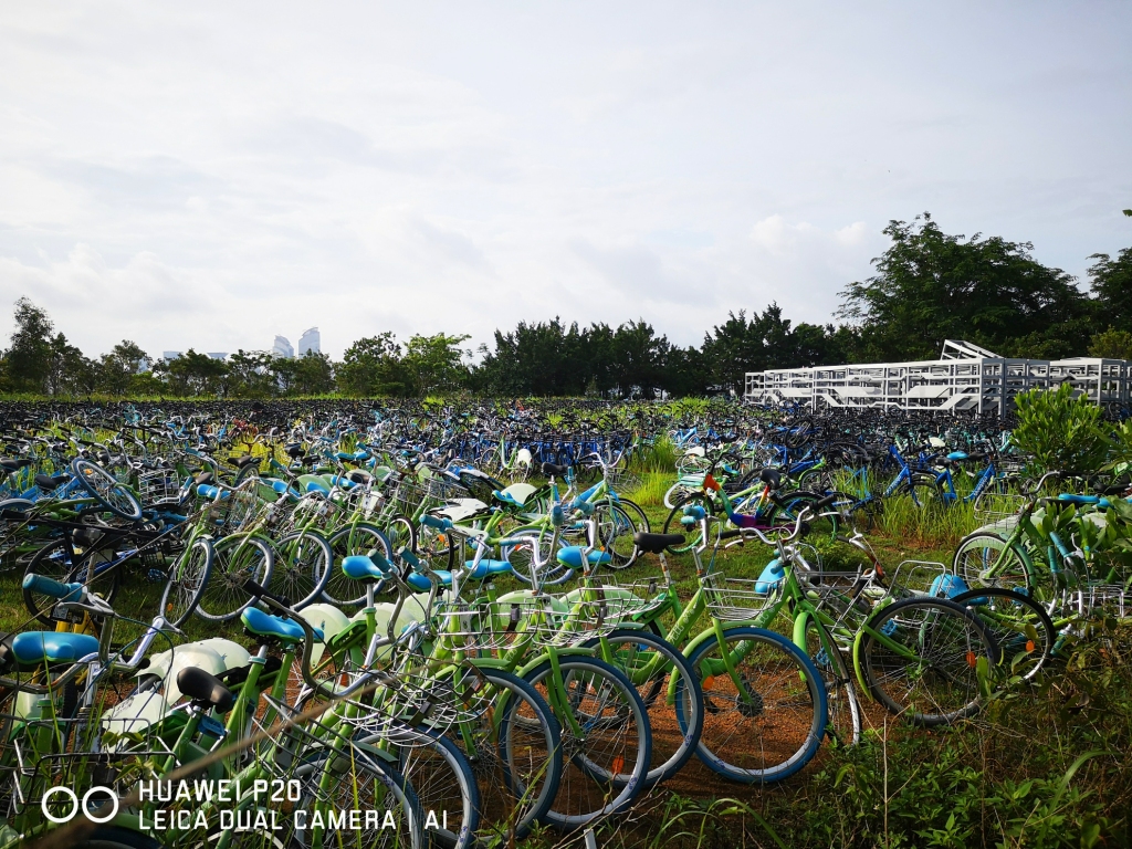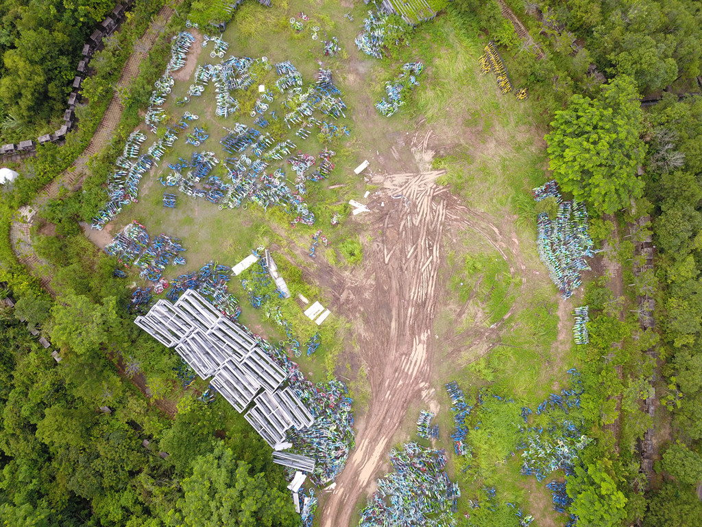 從高空俯瞰,安托山山頂?shù)墓蚕韱诬?chē)堆積無(wú)序、且周?chē)s草叢生,猶如一片共享單車(chē)“墳場(chǎng)”