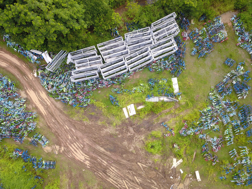 從高空中能夠看到,堆放的單車大多為目前無法正常運營的酷騎、小藍單車