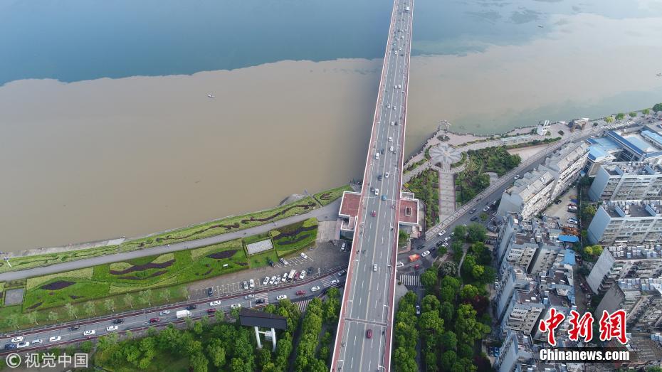 5月7日,湖北省襄陽(yáng)市,無(wú)人機(jī)航拍的漢江長(zhǎng)虹大橋處涇渭分明的漢江水面。強(qiáng)暴雨沖刷經(jīng)過(guò)去冬今春的田野地表積累的塵土,經(jīng)支流與主河道匯入時(shí),充滿污泥的洪水與主河道上清澈的丹江水形成難得一見的涇渭分明景觀。王虎攝 圖片來(lái)源:視覺(jué)中國(guó)