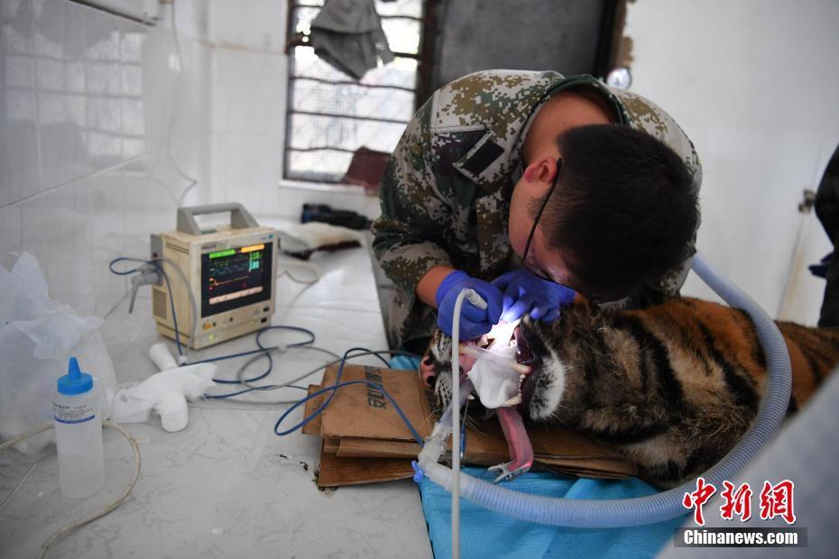 8月9日,獸醫(yī)為老虎洗牙,旁邊有心電監(jiān)護(hù)儀隨時(shí)監(jiān)測老虎身體狀況。當(dāng)日,位于昆明的云南野生動(dòng)物園獸醫(yī)通過呼吸麻醉的方式,為園中一只一歲的老虎清潔牙。中新社記者 劉冉陽 攝